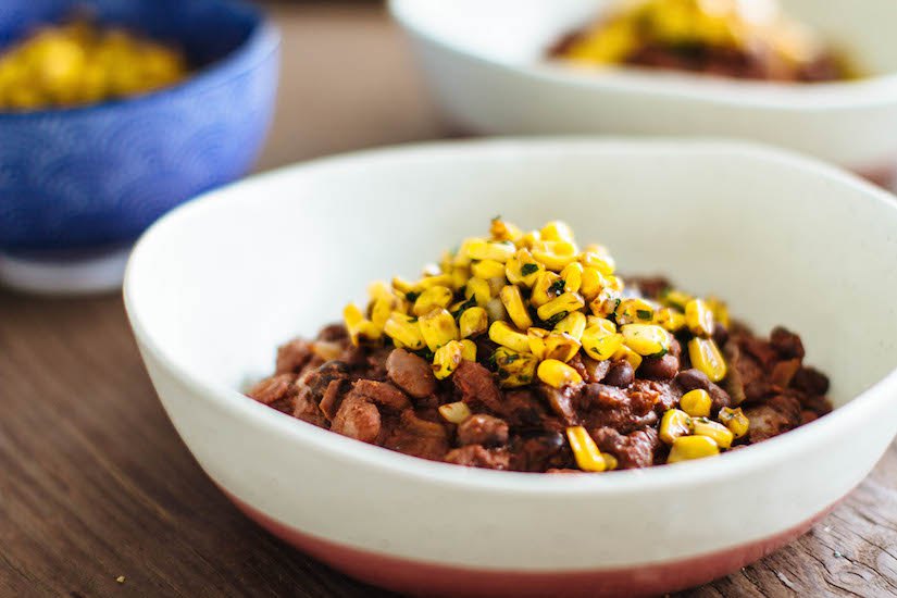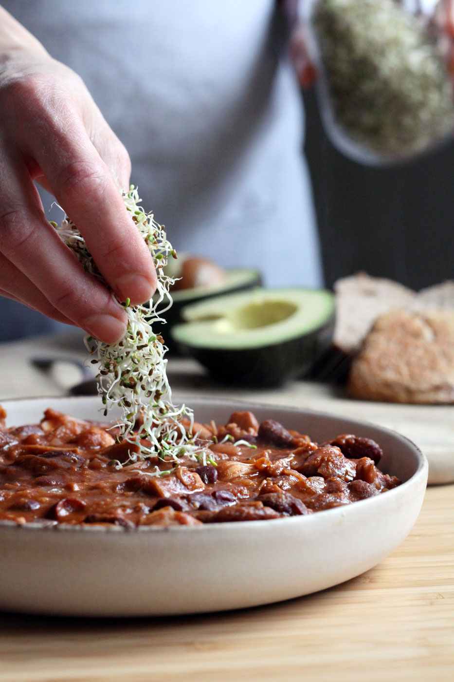 Whole food plant-based chili made with young jackfruit, kidney beans and fresh tomatoes. This version is simply the BEST we have ever made! Perfectly spiced and packed with plenty of plant protein and fibre. Can be made on the stovetop or in your slow cooker!